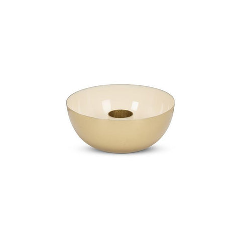 Introducing our small taper holder crafted from Metal and enamel. A high gloss interior creates a warmth that complements the satin gold finish on the exterior. Perfect for adding a modern touch your tablescape or to use a design accent. Ivory and gold lend an understanded elegance to any decor.
