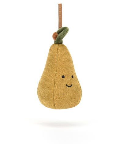 A quirky addition to any tree, the Festive Folly Pear Decoration is glamorous, sparkly and a little goofy. Our cuddly pear has gold jersey fur, a neat green leaf and chocolate stalk, and a jacquard ribbon for fastening in place.