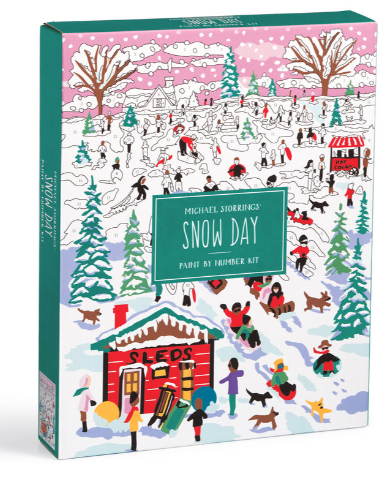 The Michael Storrings Snow Day 11x14 Paint by Number Kit from Galison captures the memories of fun, freedom and wonder while frolicking and sledding on a snow day. This set includes everything you need to recreate Storrings' wonderful artwork on your own.