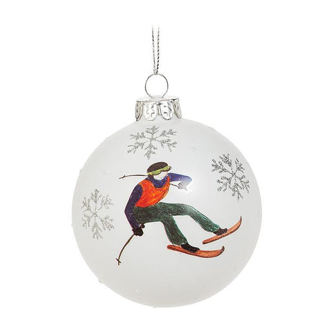 Celebrate your favourite winter sport with this charming Racer Skier Ball Ornament. Crafted out of glass, this white ball-shaped ornament features a painted ski racer ripping down the slopes, accented with glittery snowflakes, for a fun and sporty addition to any Christmas tree.